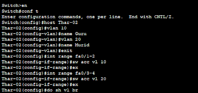 Thar-01(config)#vlan 10Thar-01(config-vlan)#name GuruThar-01(config-vlan)#vlan 20Thar-01(config-vlan)#name MuridThar-01(config-vlan)#exit
